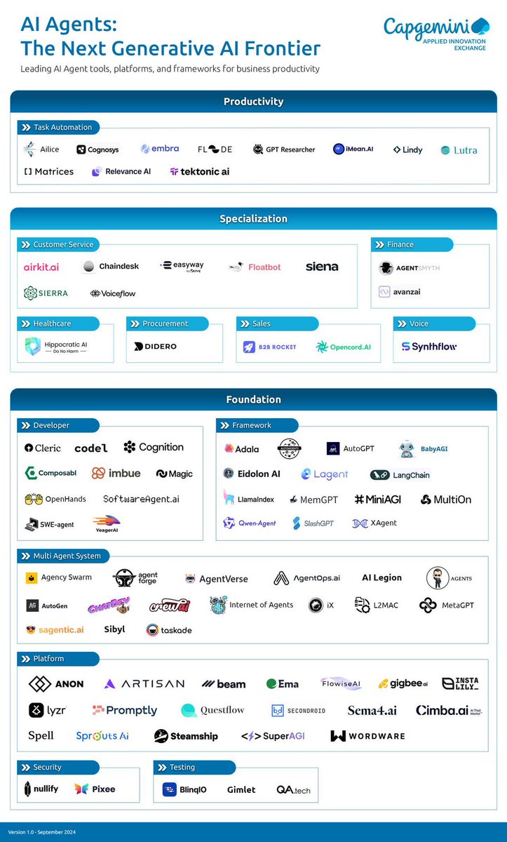 这张图展示了各种AI代理工具,分为几个主要领域,为企业提升生产力提供支持: