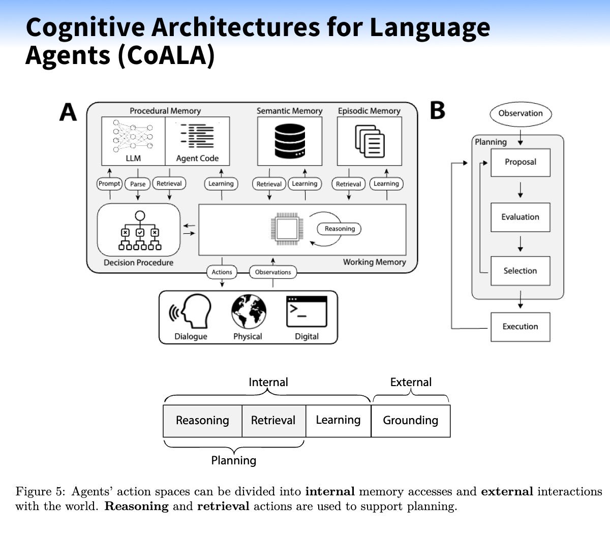 - 分为内部(推理、检索、学习)和外部(接地)的交互,协同实现智能体的规划和执行。
