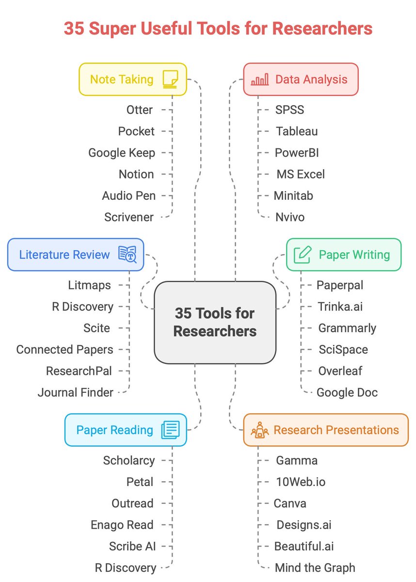 这张图展示了35款对研究人员极为有用的工具,分为六大类别: