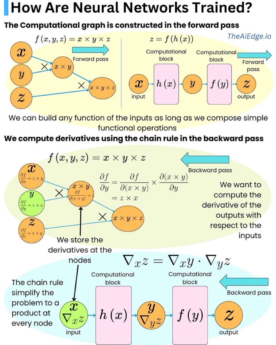 这张图解释了神经网络是如何训练的,简单来说就是通过前向传播和反向传播两个步骤来完成的。