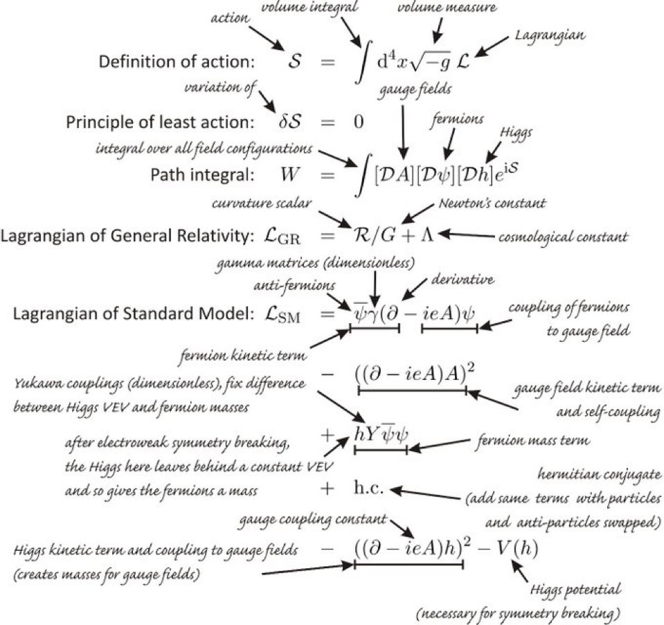 整体来说,这张图展示了物理学家如何通过一系列公式来理解和预测宇宙中的各种现象,从天体运动到微小粒子的行为。