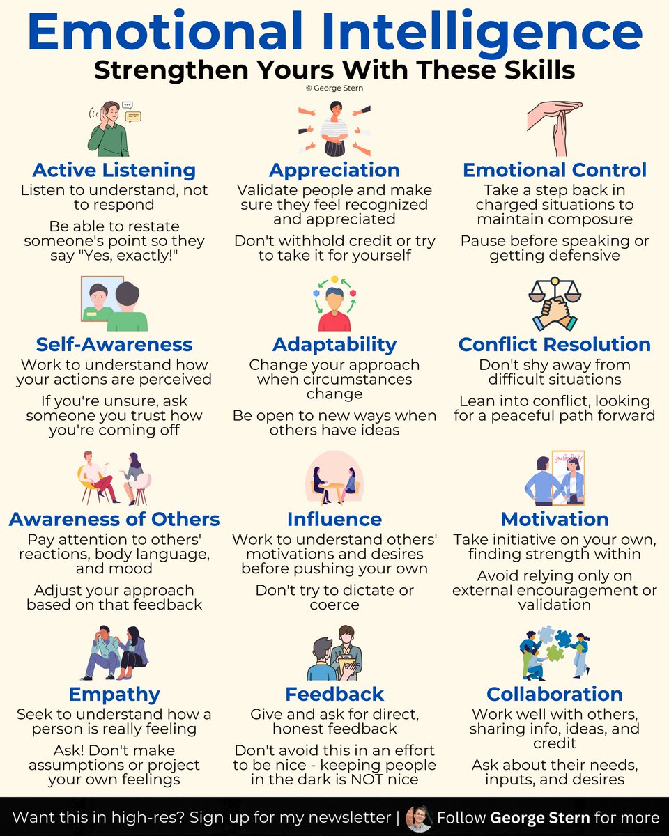 这些技能共同提升了个人的情商,使人在各种社会情境中更加有效地互动和合作。