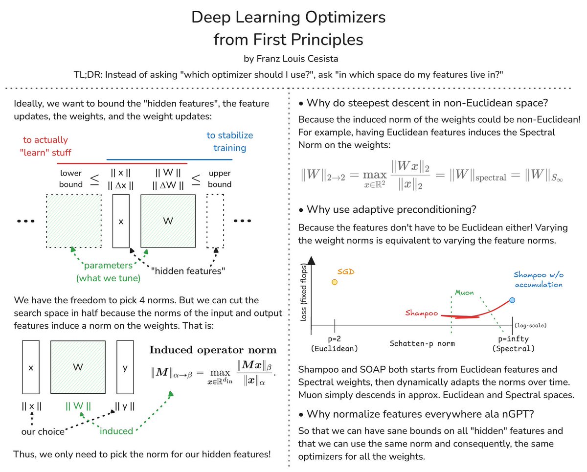- Shampoo和SOAP从欧几里得特征和谱权重开始,并动态调整范数;Muon则在近似欧几里得和谱空间下降。