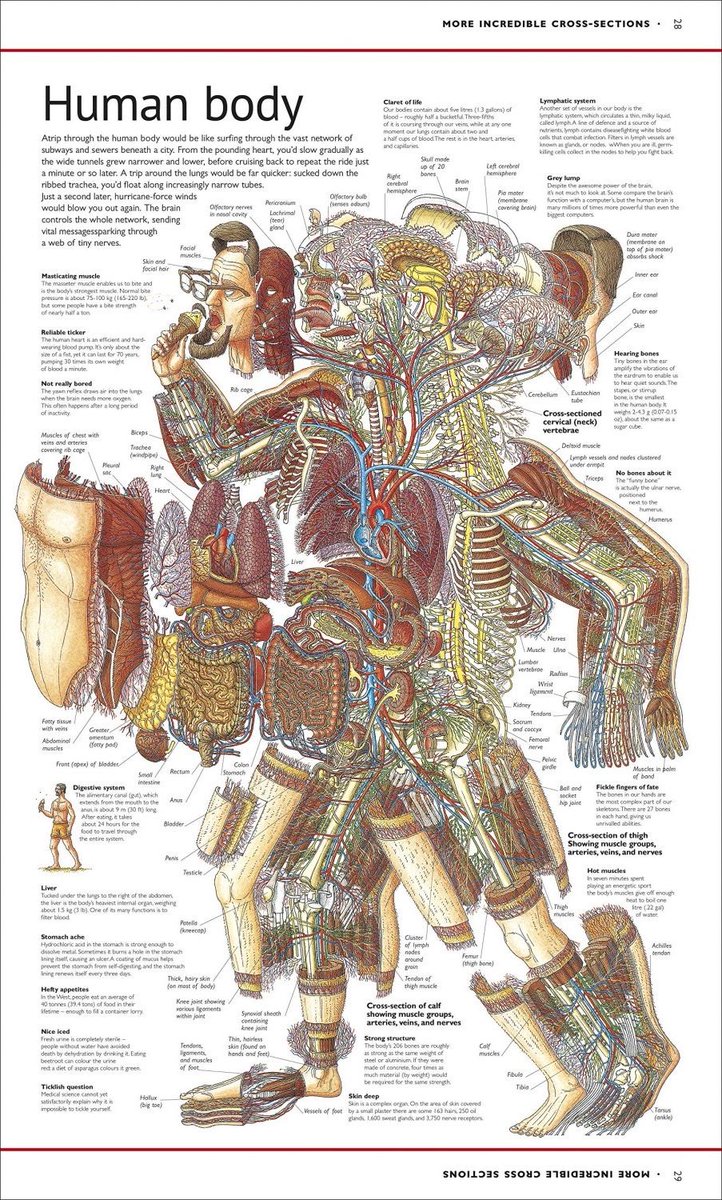 这幅图是人体的详细剖面图,展示了各个主要系统和器官的结构及其相互关系。以下是一些关键要点: