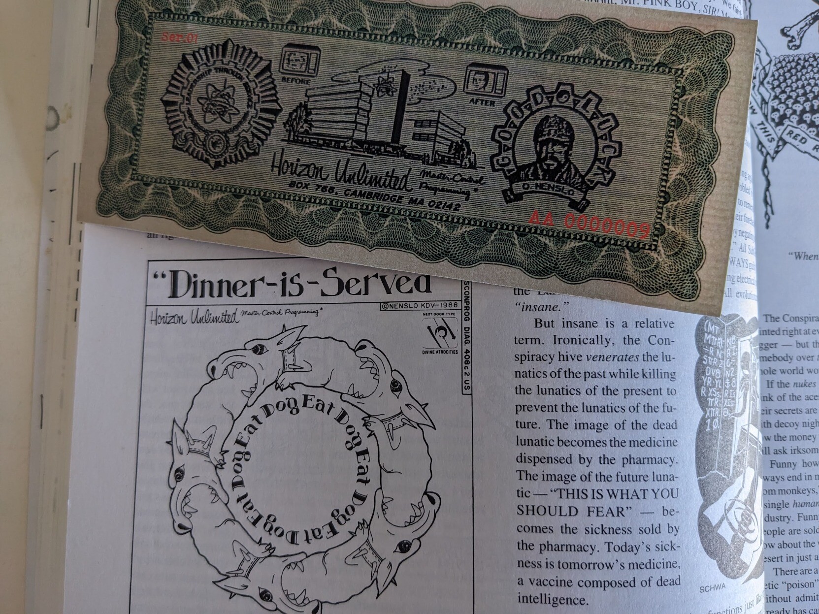 Just noticed that the Subgenius "Nenslo Dollar" that I bought on ebay has the same "Horizon Unlimited" logo as a piece of art from Revelation X.