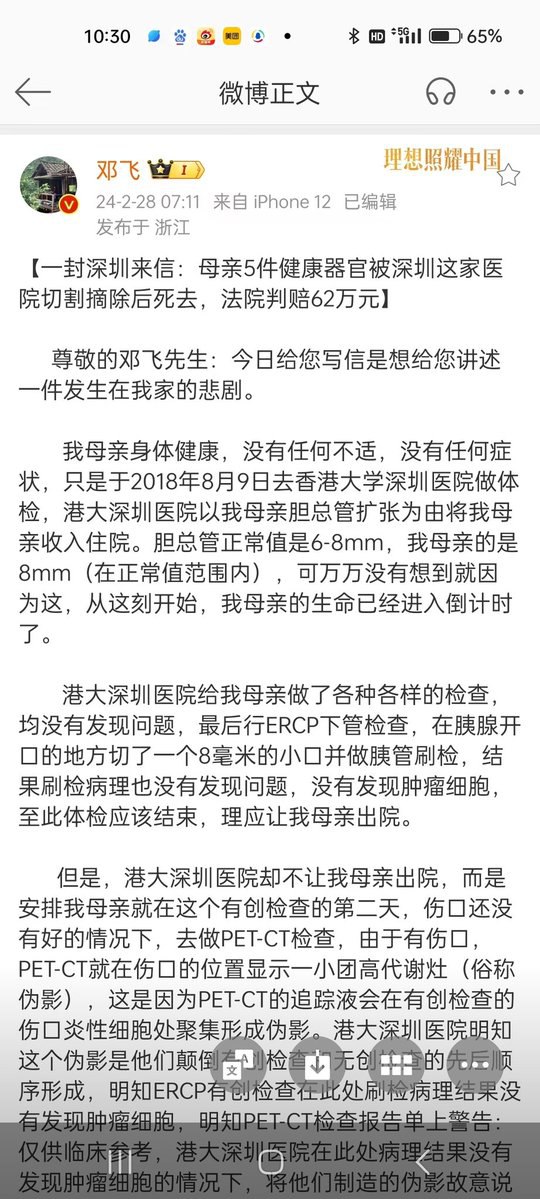 母亲完全健康,仅仅是做健康体检,就被港大深圳强行留置住院“检查”,在没有查出任何癌症指征的情况下,手术10多小时把胰腺、胆囊、脾、十二指肠、部分胃5个健康的人体器官切割摘除,一件一件地将一个健康人的健康器官摘下,总共5件,术后,器官不知所终。