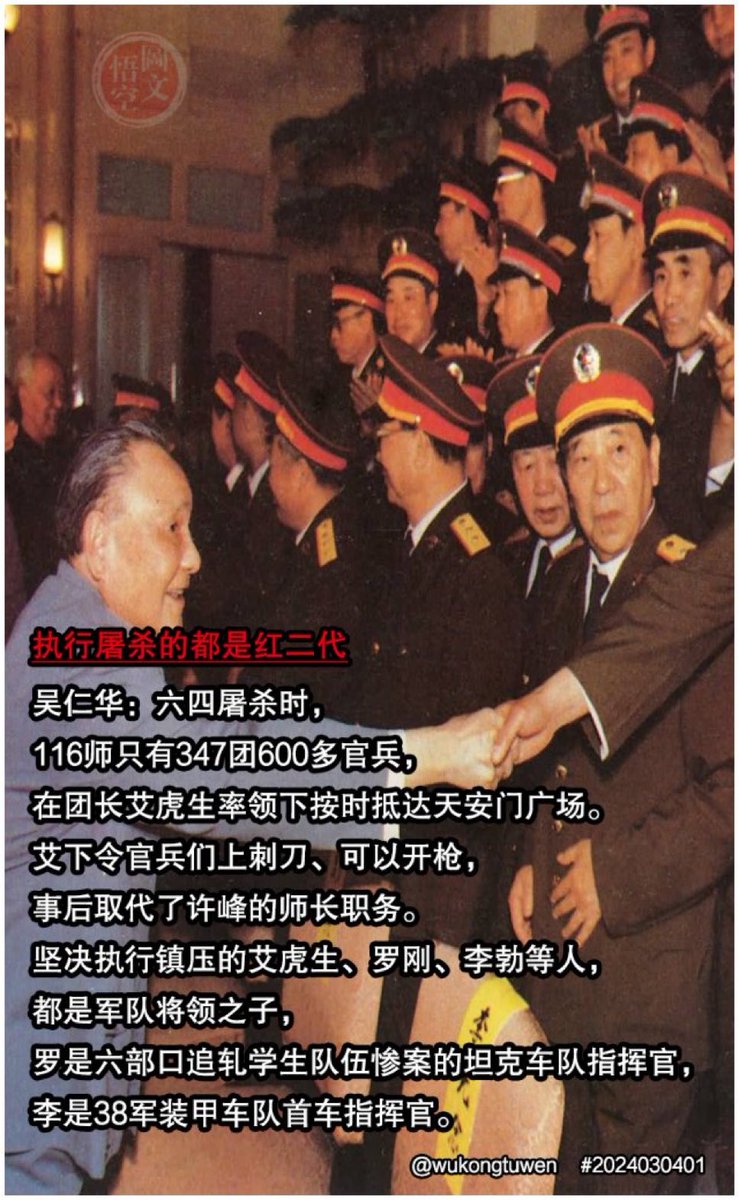🔥吴仁华:六四屠杀时, 116师只有347团600多官兵, 在团长艾虎生率领下按时抵达天安门广场。 艾下令官兵们上刺刀、可以开枪, 事后取代了许峰的师长职务。 坚决执行镇压的艾虎生、罗刚、李勃等人, 都是军队将领之子, 罗刚是六部口追轧学生队伍惨案的坦克车队指挥官, 李勃是38军装甲车队首车指挥官! https://t.co/5EDixjEdOM