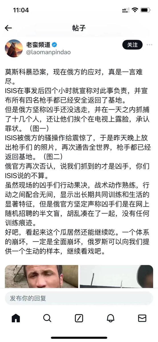1)恐襲發生前,普京公開宣稱美國警示信息是恐嚇。2)昨天IS認領恐襲後,普京還當著全世界的面栽贓烏克蘭。普京如何向俄羅斯人解釋他糟糕的判斷力呢?也許更糟糕的俄羅斯人認為普京永遠對⁉️ https://video.twimg.com/ext_tw_video/1771778419660910592/pu/vid/avc1/886x494/1Y6A5O_Y4l0B3UKJ.mp4?tag=12