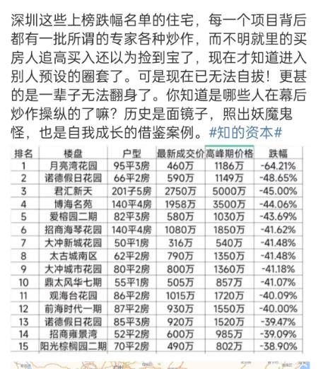 深圳这些上榜跌幅名单的住宅,每一个项目背后都有一批所谓的专家各种炒作,而不明就里的买房人追高买入还以为捡到宝了,现在才知道进入别人预设的圈套了。