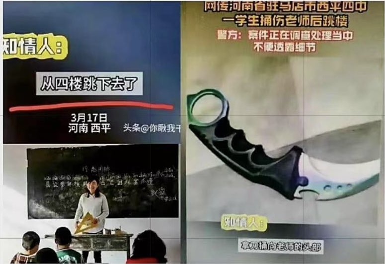 💥 2024年3月17日,网传河南省驻马店市西平县第四中学,一名学生捅伤老师后跳楼。据悉起因该英语老师下课拖堂,该学生与英语老师发生冲突,学生突然失控,拔出随身携带的刀具,向老师发起了疯狂的攻击。老师头部、背部多处受伤,倒在了血泊之中,生死未卜!该学生从四楼一跃而下,当场死亡! https://t.co/YFTk9qIQ57