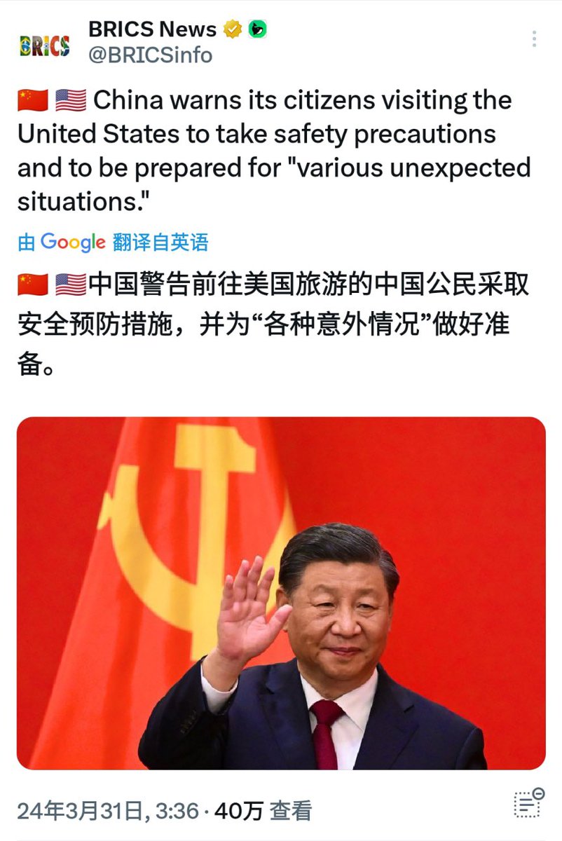 💥 中共国警告前往美国的公民采取安全预防措施,并为“各种突发情况”做好准备。看样子是南海要打仗 还是 台海⁉️ https://t.co/eCGYlU1ssz