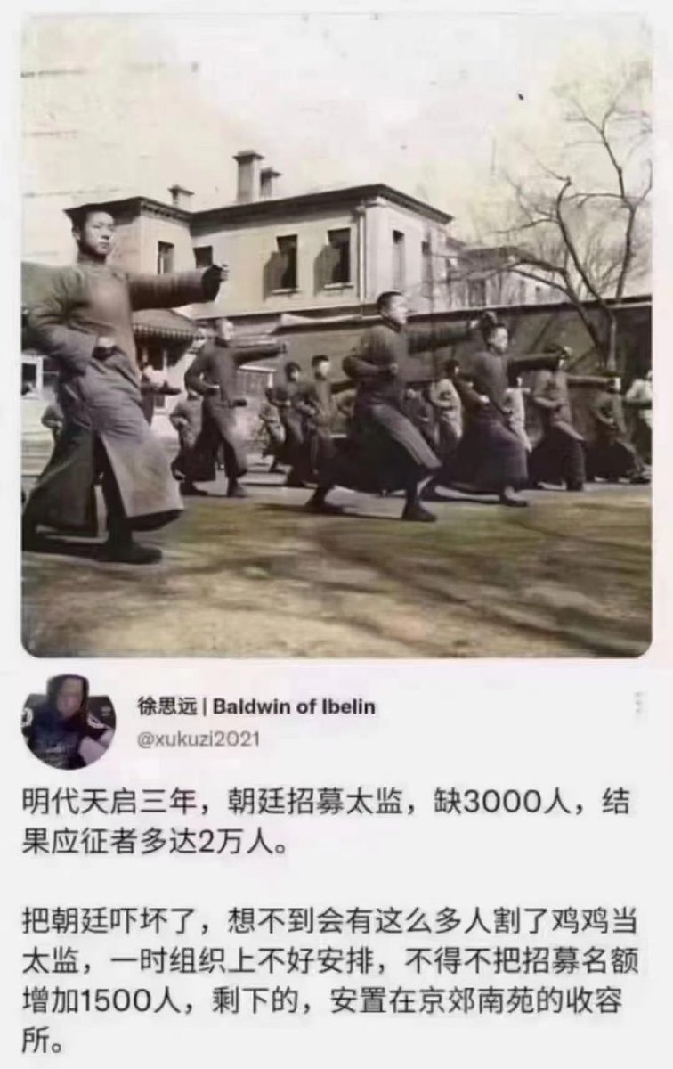这下把朝廷吓坏了。想不到会有这么多人想割了鸡鸡当太监。一时组织上不好安排,不得不把招募名额 增加1500人,剩下的安置在京郊南苑的收容所。