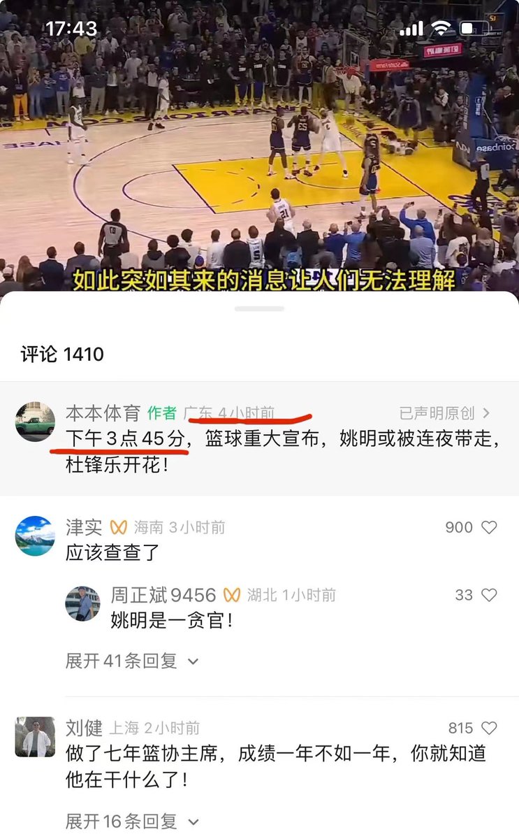 4月1日,网上不同来源传出,中国男篮主席、前著名篮球明星姚明被当局带走。海外社交平台X(前推特)上有网友转发大陆网络消息称,「下午3点45分,篮球重大宣布,姚明或被连夜带走,杜锋乐开花。」