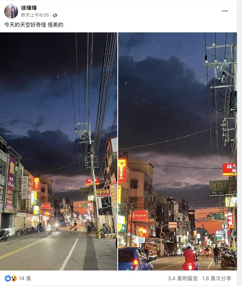 🔥 4月2日晚上8時左右,有台灣女網民於Facebook群組「路上觀察學院」發布多張台灣天空出現奇景照片,形容「今天的天空好奇怪,怪美的」。不少網民大讚天色漂亮,但至晚上8時17分,有男網民留言「漂亮,但有921大震(1999年9月21日台灣7.3級地震)前傍晚的味道,怕怕的,要小心注意的」