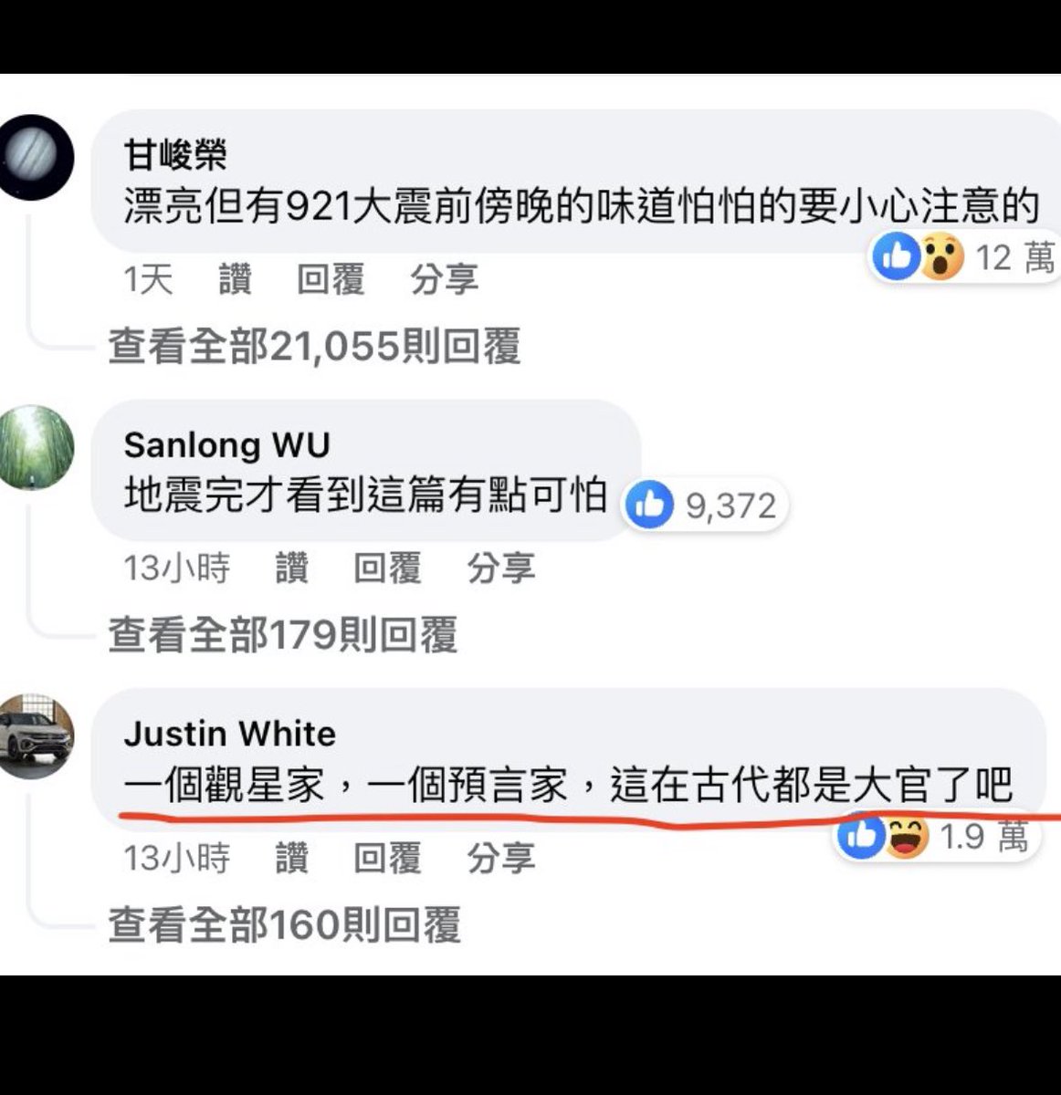 💥 該男網民留言一出,很多網民質疑他危言聳聽,要求收聲,「你給我閉嘴!」,然而僅僅半天後,台灣附近今早真的發生7.2級大地震,網民知悉後紛紛轉軚,驚呼「這預言!」、「神預言家!」、「超準」、「朝聖未來人」、「準過印度神童」、「大大可以去氣象局上班了」、「看來大地震前,天空真的會有異象」。該男網民則以「讚好」來回應留言!