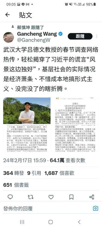 武汉大学教授吕德文田野调查踢爆习近平风景这边独好的谎言。图:翻摄自X