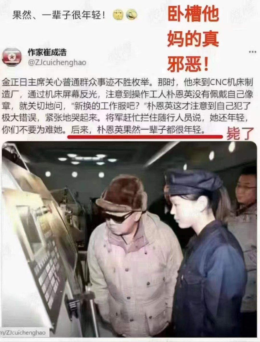玄松月一边跟在金正恩身后,一边拿出手机。其他男性干部都在看着金正恩手指的地方,玄松月却只是看着手机。