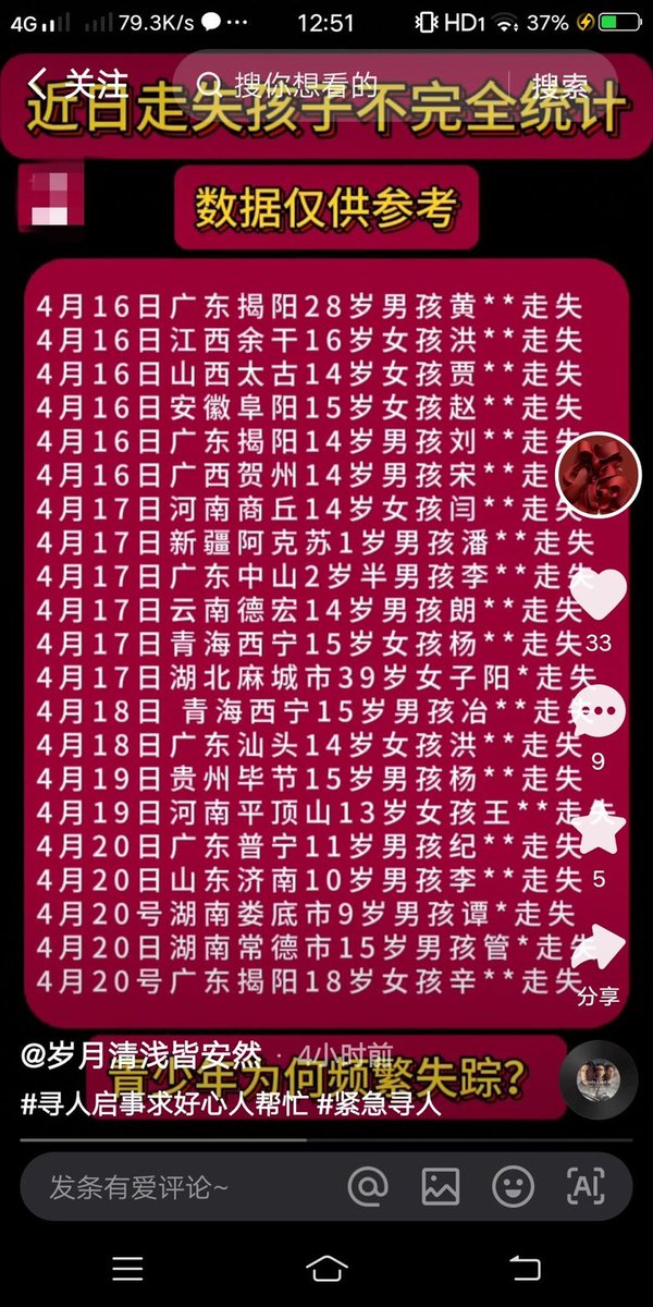 🔥 这是中共国近一个星期丢失青少年的部分名单,面对着人民的怒斥,作案组织依旧在疯狂的捕杀青少年,摘取他们的器官。