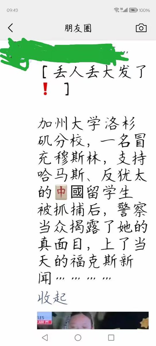 🎯【网传】加州大学洛杉矶分校,一名冒充穆斯林,支持哈马斯、反犹太的留学生被警察抓捕后,发现她来自中共国,姓名刘丽君,陕西铜川人,中国人民大学公派赴美研究生,中共党员。被抓捕后,警察当众揭开了她的口罩和围巾,上了当天的福克斯新闻……(注:以上信息未经证实)
