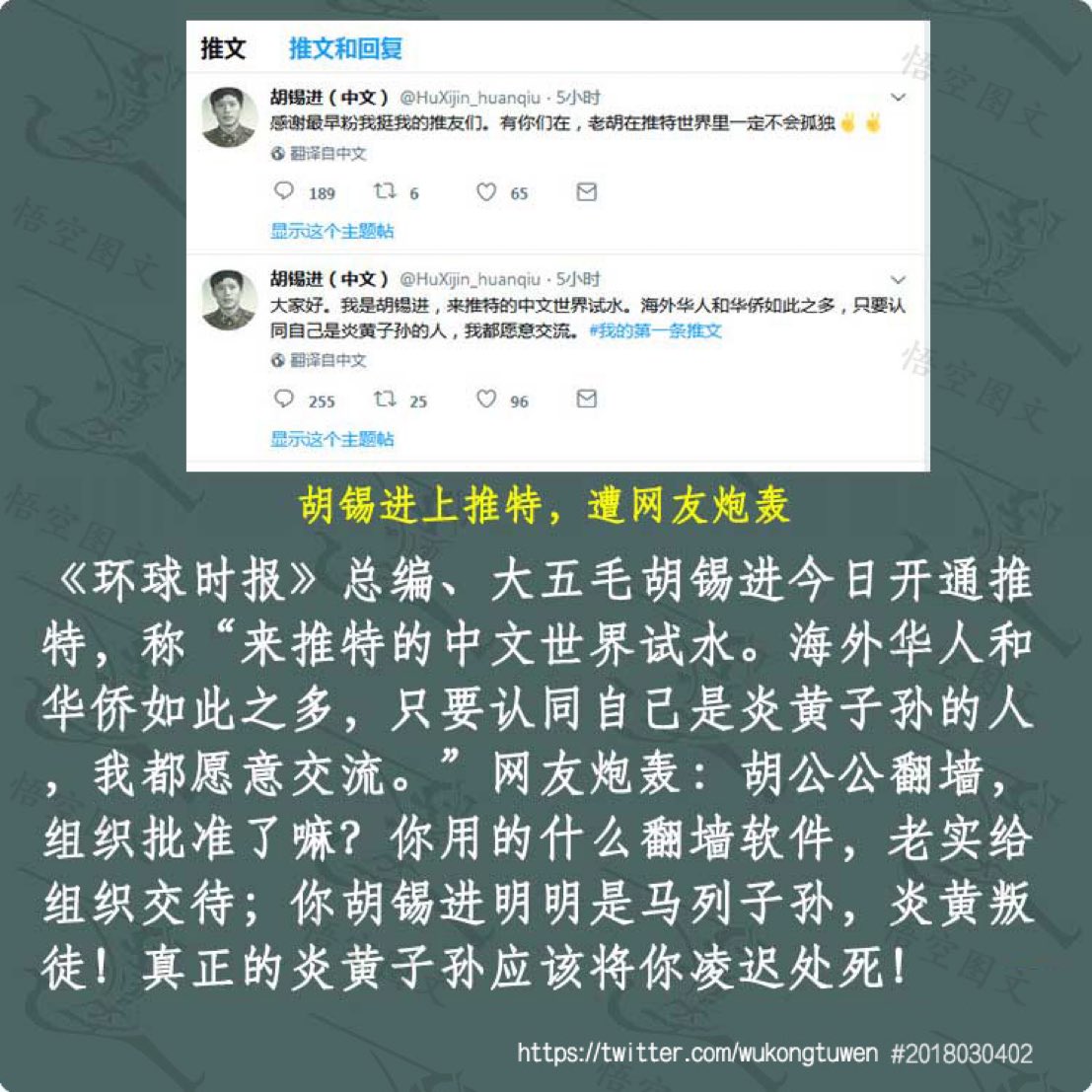 🔥 胡锡进上推特,遭网友炮轰❗️💥 https://t.co/cMuujcBjX5