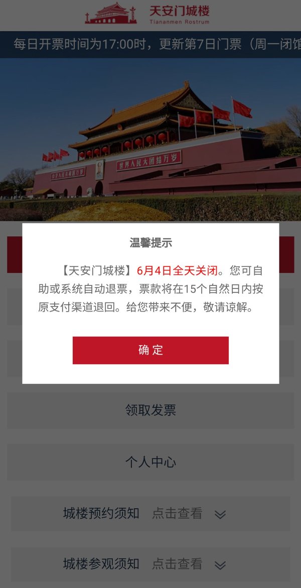 还有网友发现,现在进入天安门城楼预约网站就会出现“天安门城楼6月4日全天关闭”的弹窗提示。