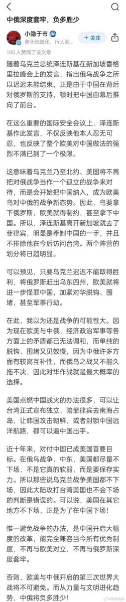 泽连斯基在香会上的发言,破天荒地指出了俄乌战争之所以迟迟未能结束,正是由于中共在俄罗斯背后支持它的结果。这回小泽不装了,可以说公开撕破脸了。在这样重要的会议上公开撕破脸,一方面说明乌克兰胜利在望,一方面说明到了揭锅的时候了。当然不排除他已经到了忍无可忍的地步,也是整个欧美对中共强烈不满达到了沸点。