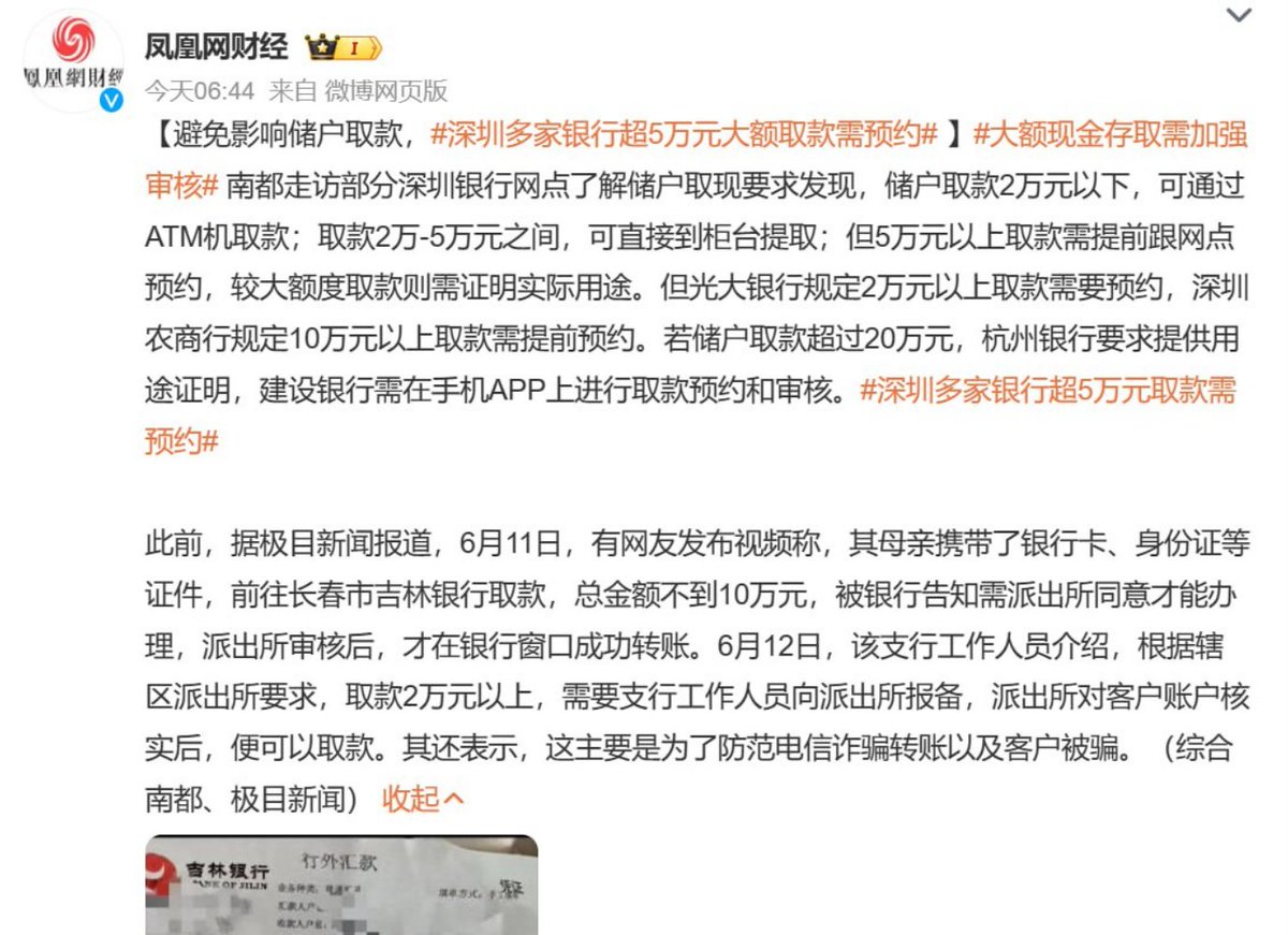 💥6月13日,深圳多家银行超过5万元大额取款需要预约。记者走访深圳部分银行网点,发现取款2万元以下,可通过ATM机;取款2-5万元之间,可直接到柜台提取;但5万元以上取款需要跟网点预约,较大额取款则需证明实际用途!