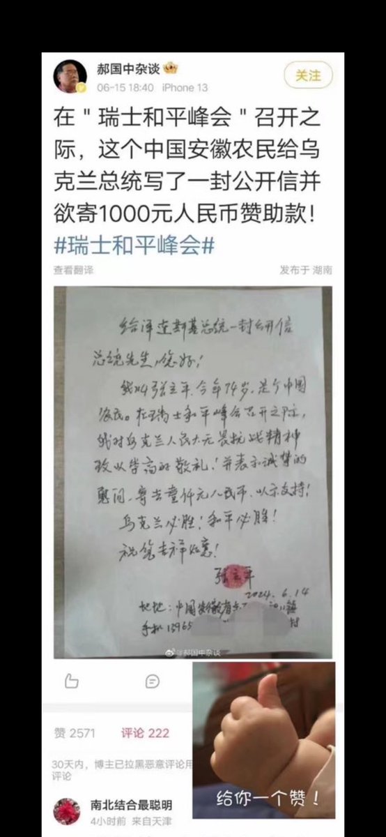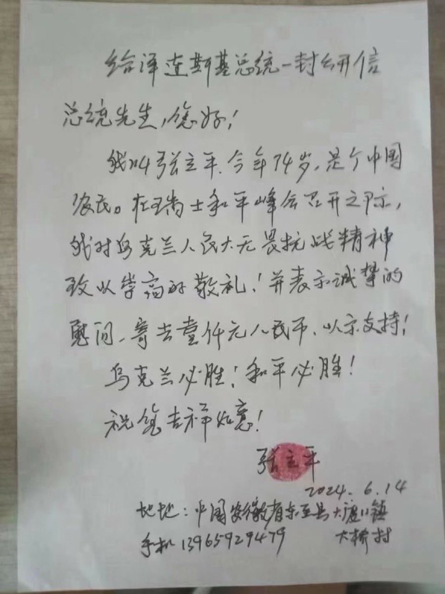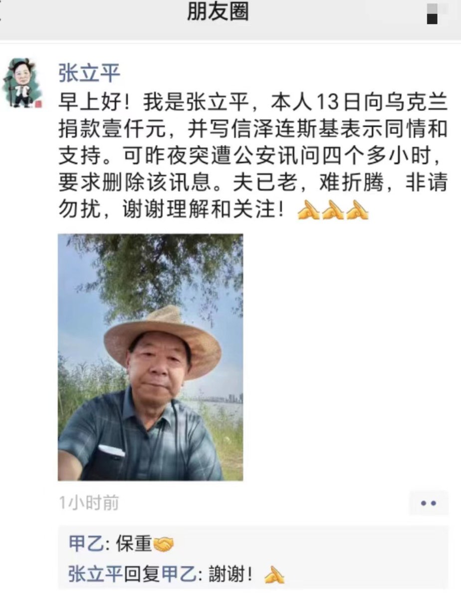 🔥 安徽省东至县74岁老农民张立平写公开信给泽连斯基,表示支持和同情,并捐款 1000元。遭到中共警察非法审讯折磨四个多小时,不胜其扰……