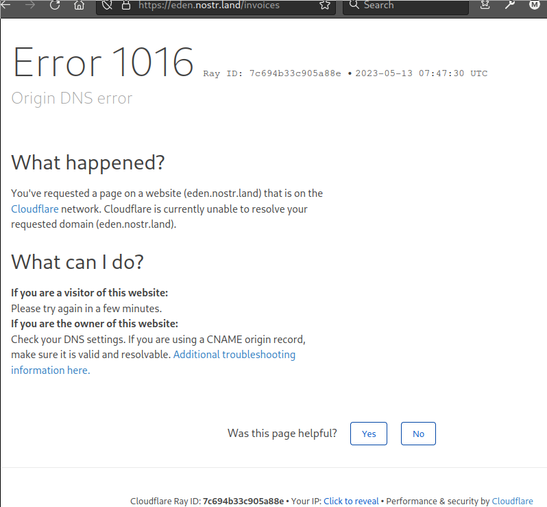 For the last day or so, wss://eden.nostr.land/ giving me HTTP 530 from Cloudfare, and the HTTPS site: