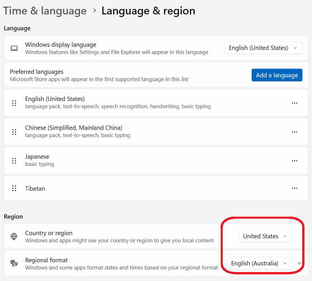 终于搞清楚了,Windows 11 用澳洲时间格式,应该只在 Regional Format 里设。如果把 Country 设成澳洲的话,输入法切换时会出现两个英文键盘。