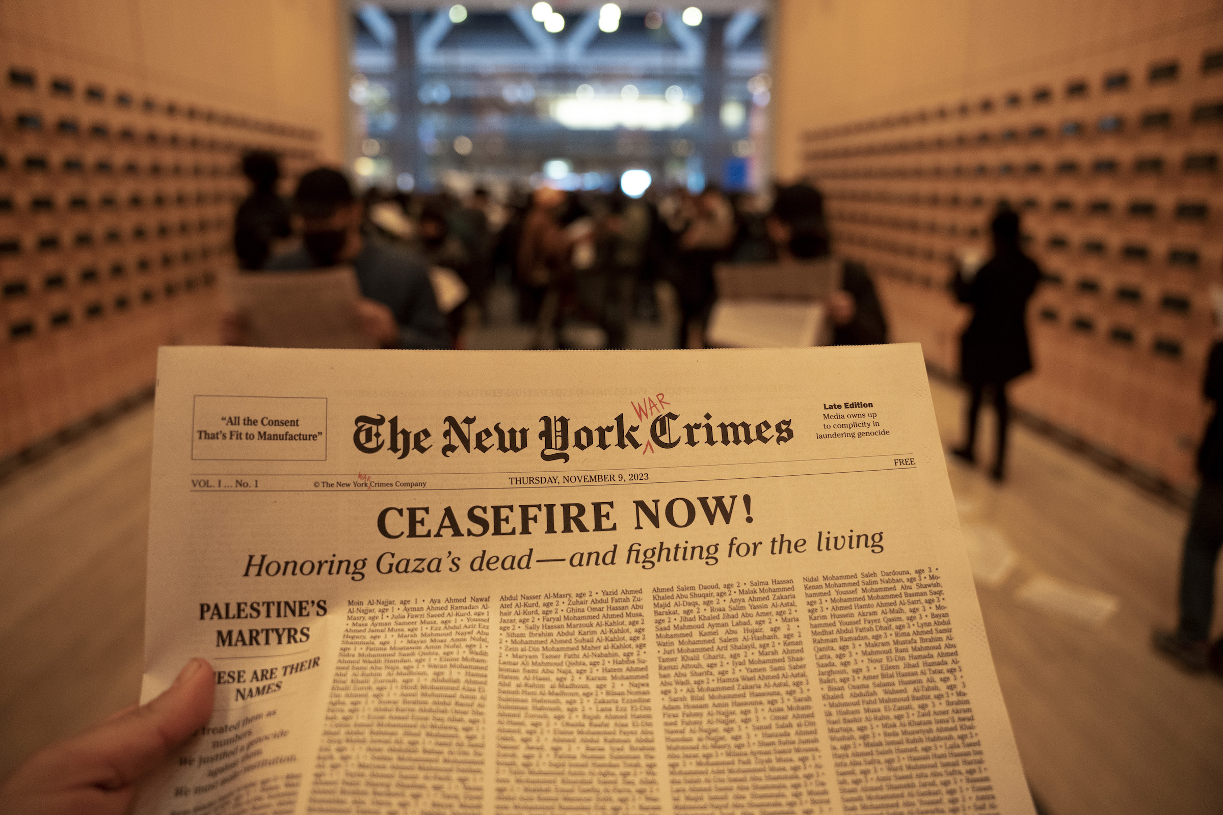Artists and writers handed out copies of a “New York Crimes” broadsheet and urged the paper to support a ceasefire.