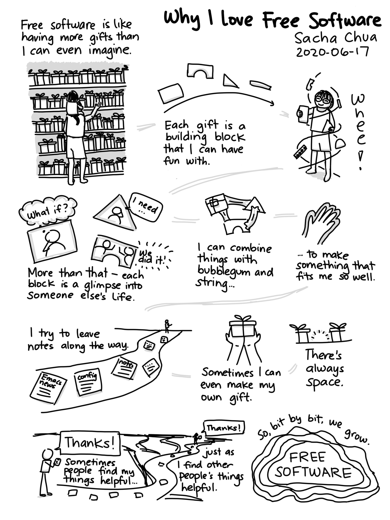 We love free software. With much thanks to the talented @SachaChua nostr:npub1u2rf9yrjtc8l99j8da84qnzac5d8sz6euy288jq7nacwke0tap6s8k4urs for illustrating the reasons. See https://www.sachachua.com/blog/ for emacs news and more! #FreeSoftware