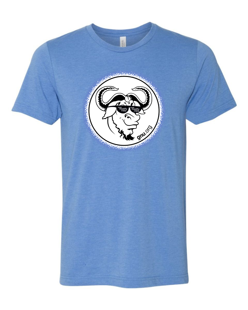 Our GNU head T-shirt is back in a new color and with new sunglasses! Pre-order our sunny GNU with sunglasses in heather blue by Sunday July 16th to receive your shirt in August and rock this summer with a GNU by your side: https://shop.fsf.org/tshirts-hoodies/pre-order-gnu-head #WorkingTogether