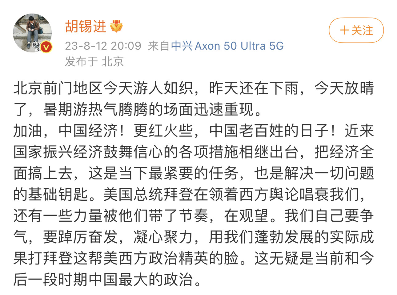这世道,属于是连胡锡进都不知道该怎么夸了,因为实在是没物料。你瞧,中国还有希望的证据,只剩下“北京旅游点依然挤满人”了。