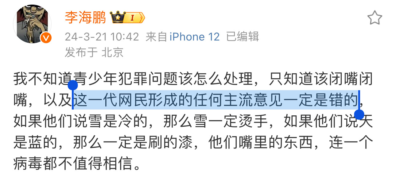 这也不失为一个指标:不是说简中所有共识都是错的,但是在热点事件中,能在简中浮出水面翻起浪花,既不被降流也不被打压的那些“主流”意见,就一定是可疑的。现在一边倒的意见就是从重从快,甚至还有说监护人也要入刑的。先不说对不对吧,毕竟这只是一个方面,而按理说什么事情都能吵半天的法学界,居然没有制衡的声音,你不觉得这很不正常吗?如果连这种不正常都没有意识到,就觉得这是所谓“主流意见”,那就是对简中舆论生态的恶劣性缺乏理解了。