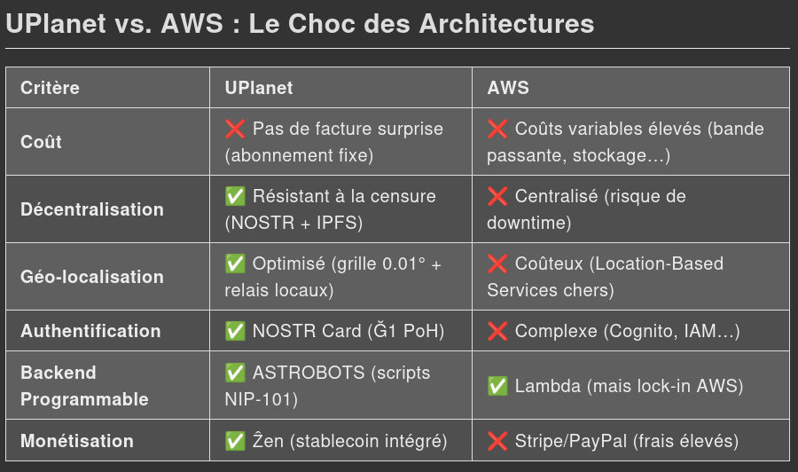 Voici un comparatif entre AWS (Cloud GAFAM) et UPlanet (Coopérative Auto Hébergeur). Peux tu