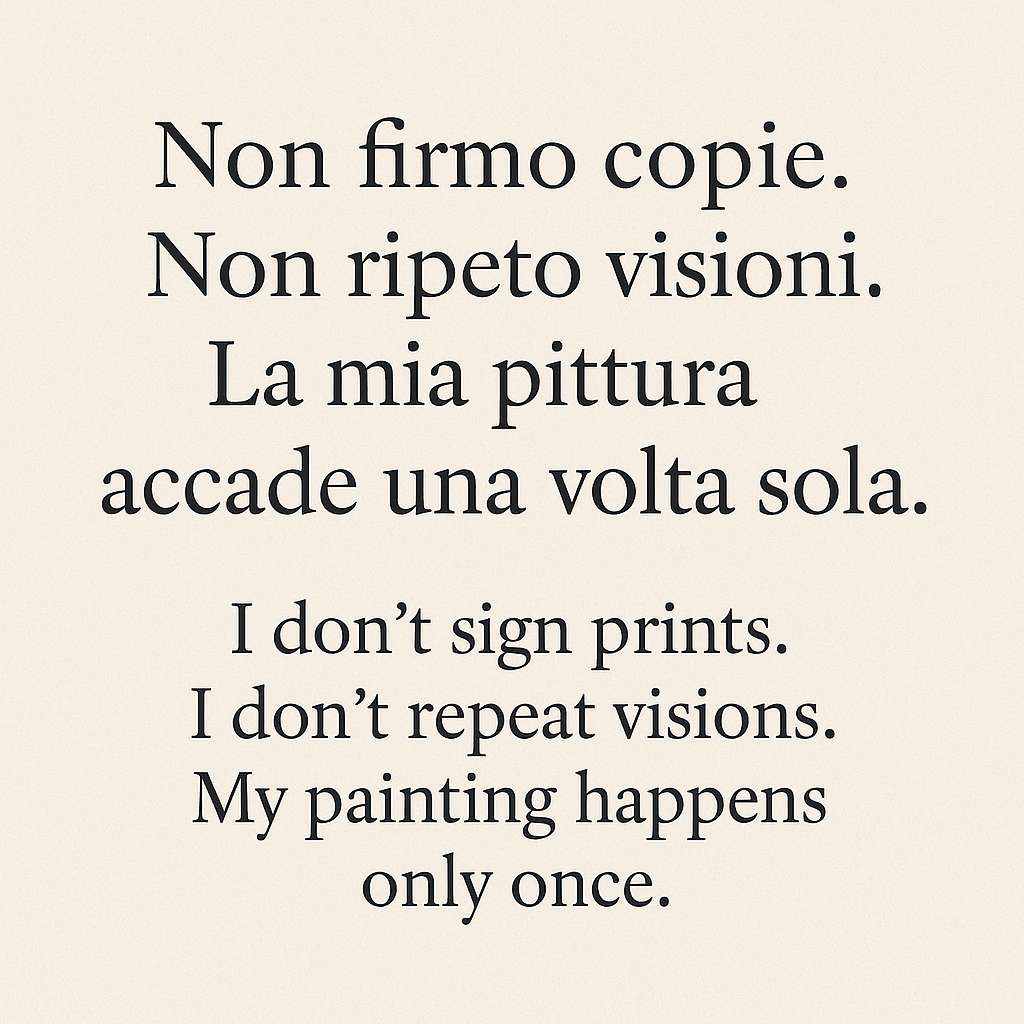 I paint with the materials of centuries: oil, canvas, light. I don't follow fashions, I don't chase trends.