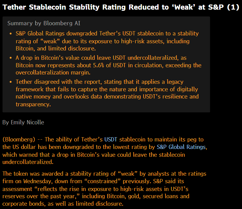 S&P has downgraded Tether’s stability rating to “weak,” stating that #Bitcoin now makes up 5.6% of USDT reserves, above the 3.9% buffer needed to absorb a price drop.
