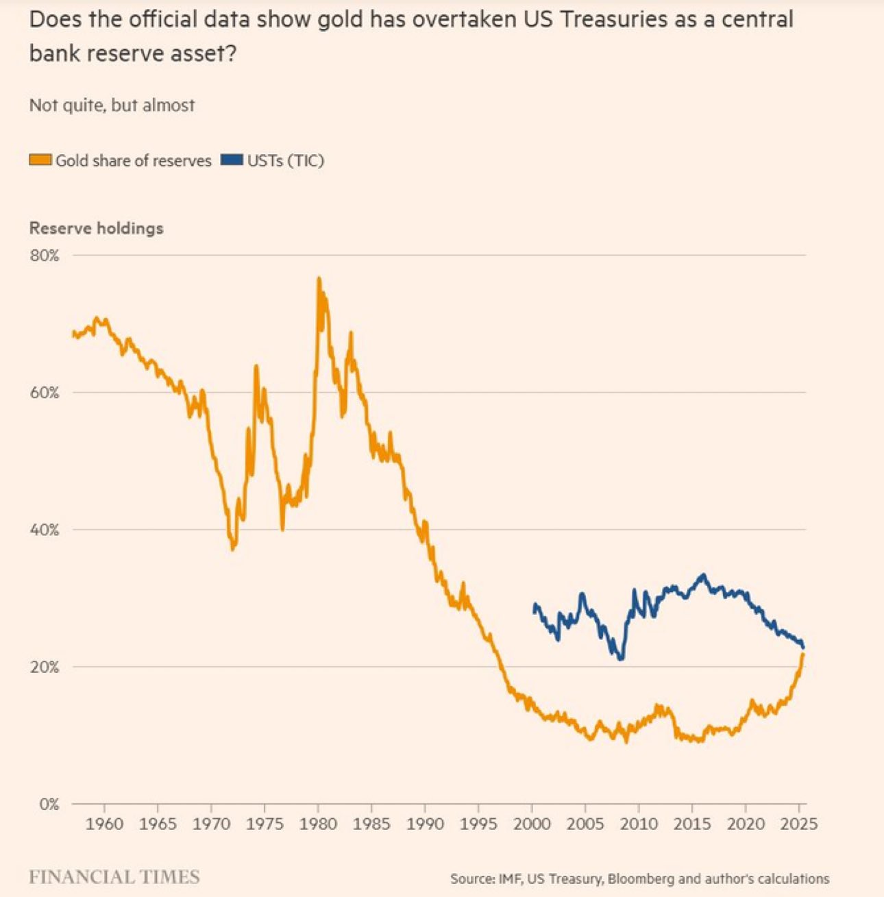 Gold’s share of central bank reserves is now close to overtaking U.S. Treasuries, per FT.