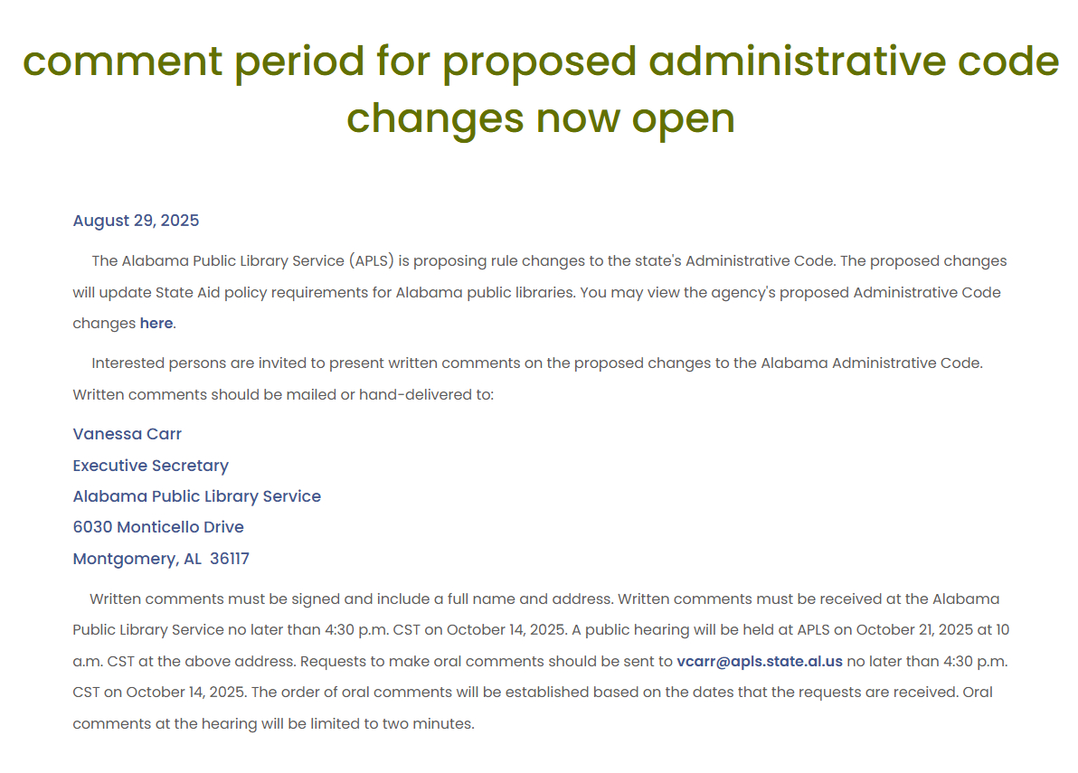 9. Submit written letters to the Alabama Public Library Service directly, request to speak at the September 18th or October 21 hearing in Montgomery, or use Read Free Alabama’s tool to automatically send a pre-written letter to the board.