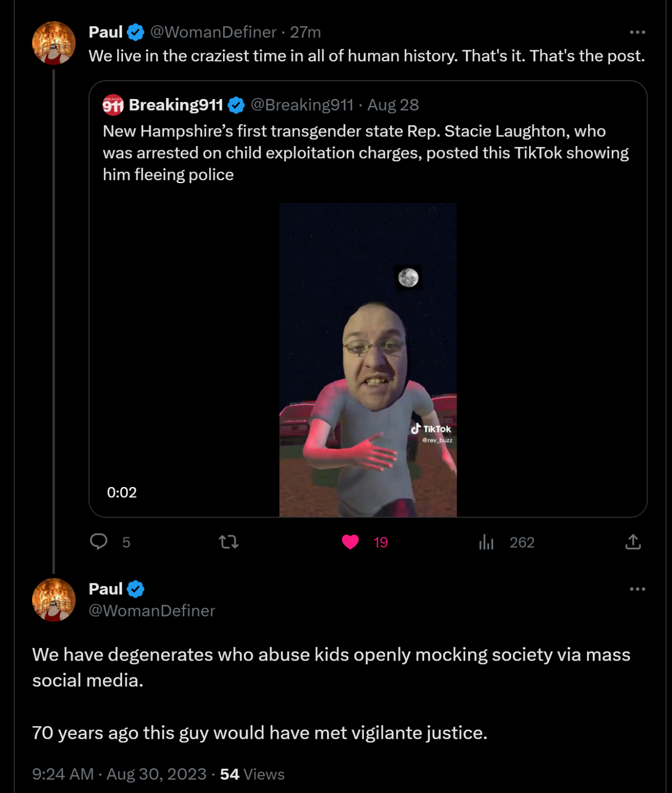 New Hampshire’s first transgender state Rep. Stacie Laughton, who was arrested on child exploitation charges, posted this TikTok showing him fleeing police
