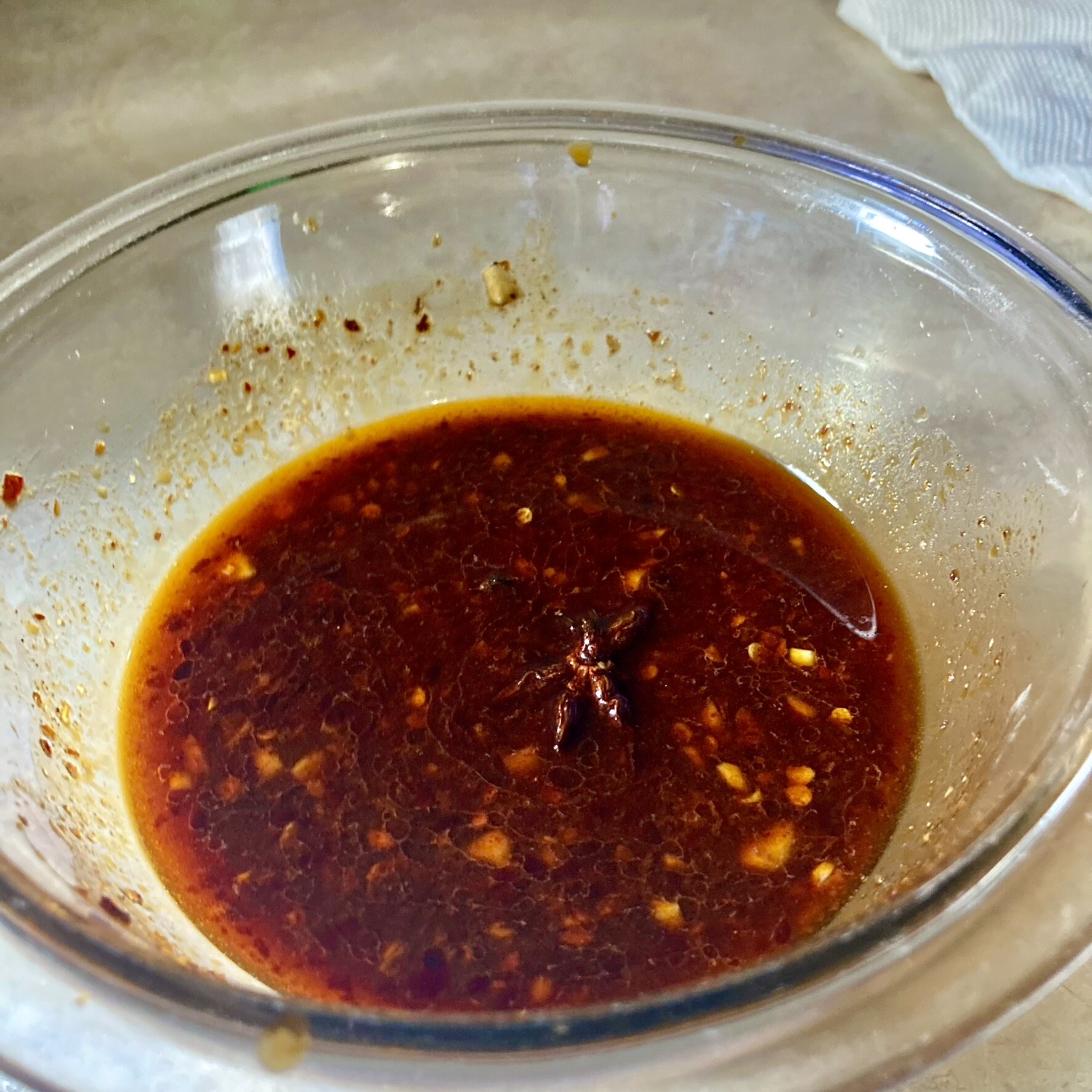 I made this up years ago. I call it Asian Black Marinade (or sauce when thickened) on account of the fungus and bean sauce even though it's very red. Notice no acid, so it can go long. I'll squeeze a lime in around lunch time.