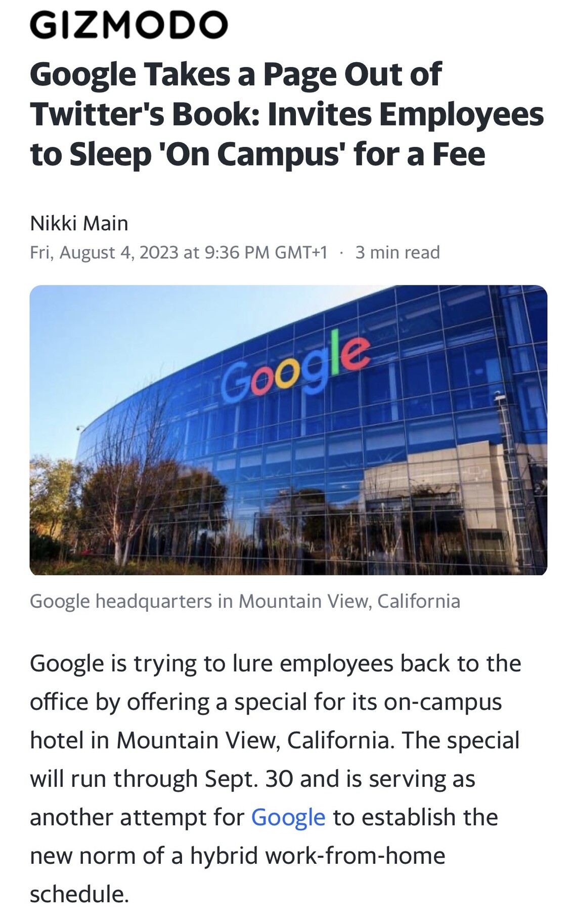 wtf Google is actually trying to charge money to employees to sleep AT work. This would never make any sense and especially not from one of the biggest companies in the world https://news.yahoo.com/google-takes-page-twitters-book-203600727.html