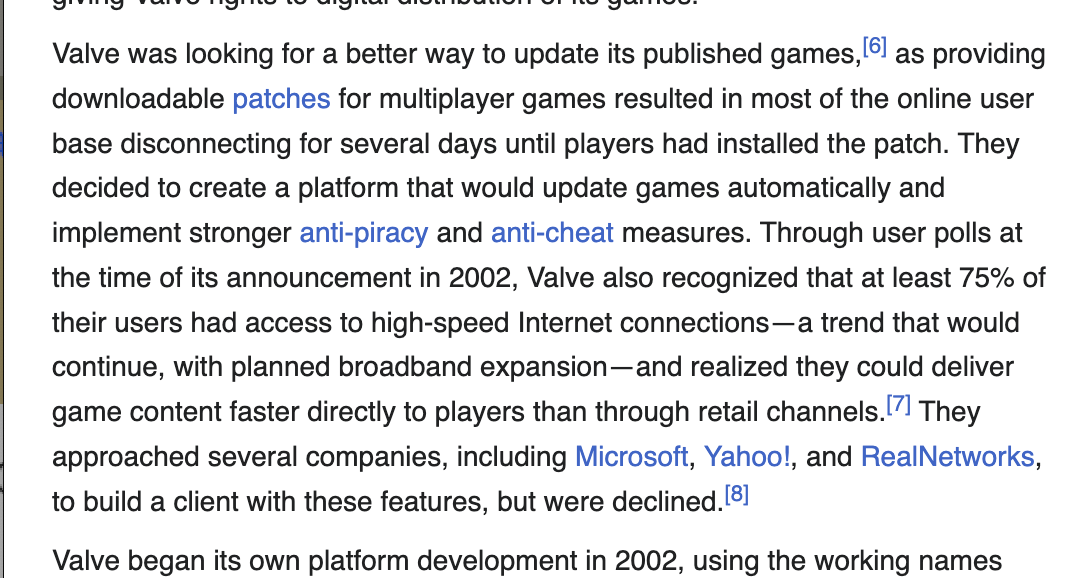 Before deciding to make Steam, Valve actually approached several companies, like Microsoft, Yahoo! etc looking for someone who had or could build a good solution for updating their published games reliably. Imagine if Xbox Live with all patching features existed already, maybe Valve would end up using that system on PC and Steam would never be.