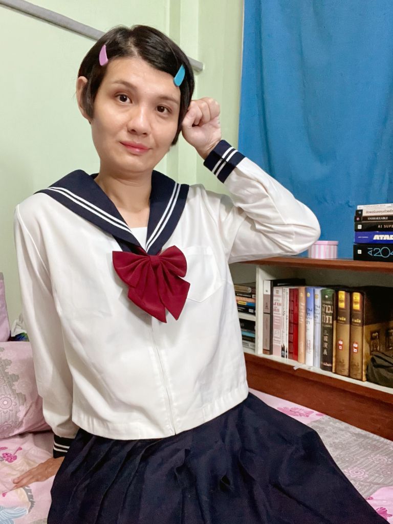It's so contrast pic because I wear a Japanese secondary school uniform but background's books is 三国演义 (San Guo Yan Yi/ Romance of The Three Kingdom).