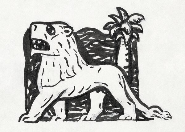 Lion Stands in Front of a Palm Tree
