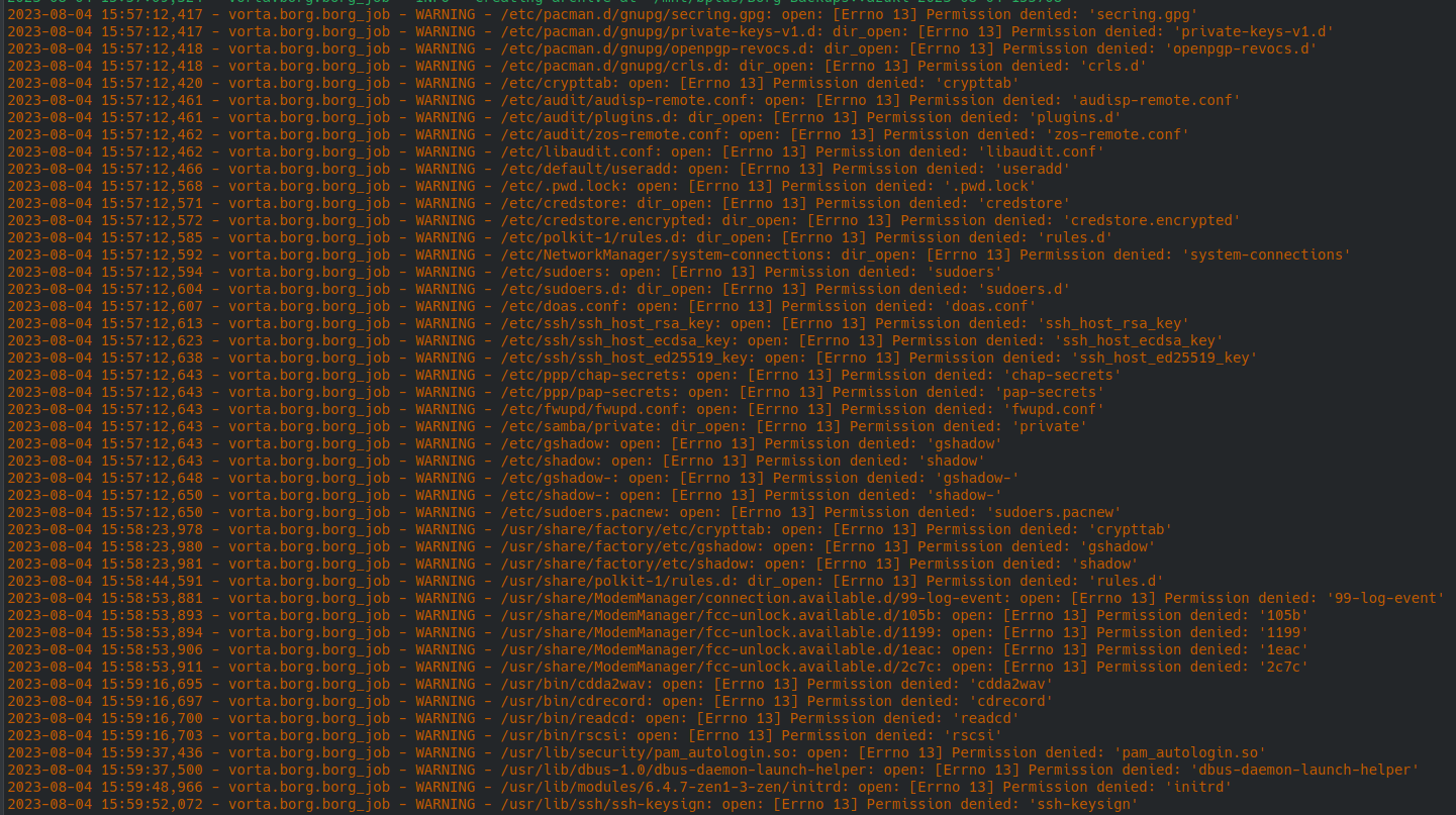 nostr:npub1uvfvlddmhuh4hu4teupjs2lkdn8x3htrrw7jlwzuv0ushumkwnhqxjteda nostr:npub1630a9mw3hkku5p9ay0eddcqezgy35j3fhcws22xwthfcmp97q0esnsstu9 the files it can't read are mostly in /etc, so namely pacman's gnupg files and SSH keys.