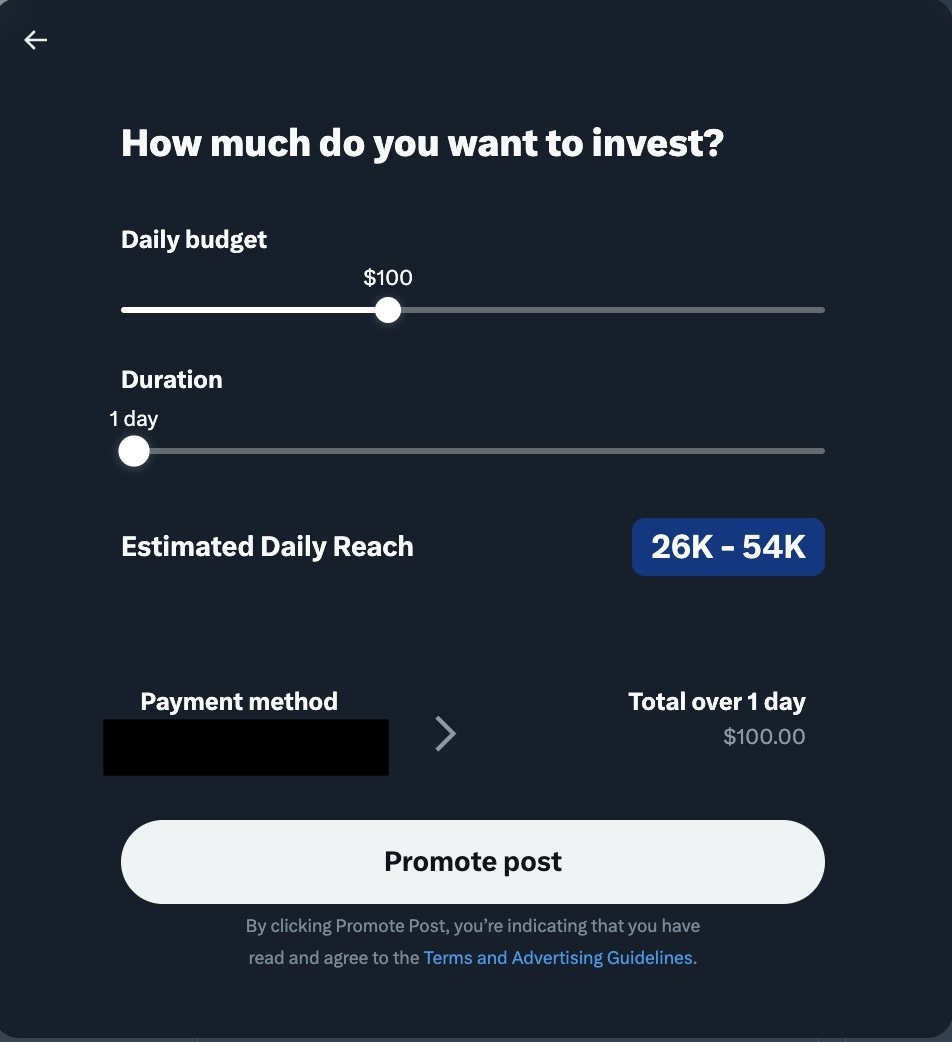 - So I thought, OK, what if I clicked the "Promote" button? X promises 26k impressions for $100. They delivered about ~20 and hid the post.