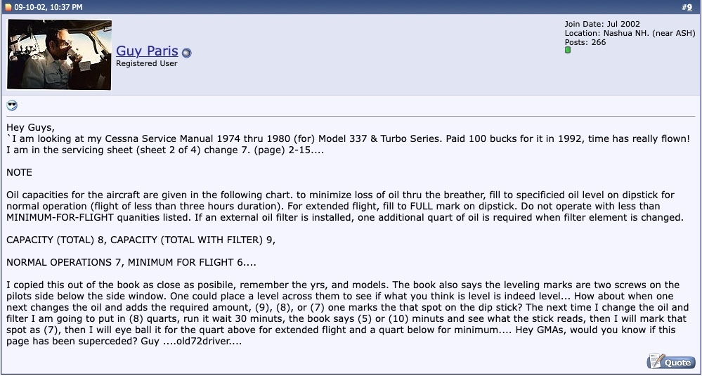 WHEN I BOGHT MY NEW SKYMASTER I SAW THE OIL RAGS ON THE HEADS AND NOTICED THE POST-BUY AP ONLY PUT IN 7 QUARTS OF OIL AND I TORE HIM A NEW AHOLE…..HAHAHA THAT POOR SUMBITCH SWORE HE PUT IN ALL 8 QTS BUT I SAID BULLSHITTTTT I ONLY SEE 7 ON THAT INDICATOR…….FLYIN HOME I CHECK IT AGAIN AND ADD ANOTHER QUART AND IT STILL ONLY SAYS 7 QUATRS HAHAHAHHAHAHAHAH