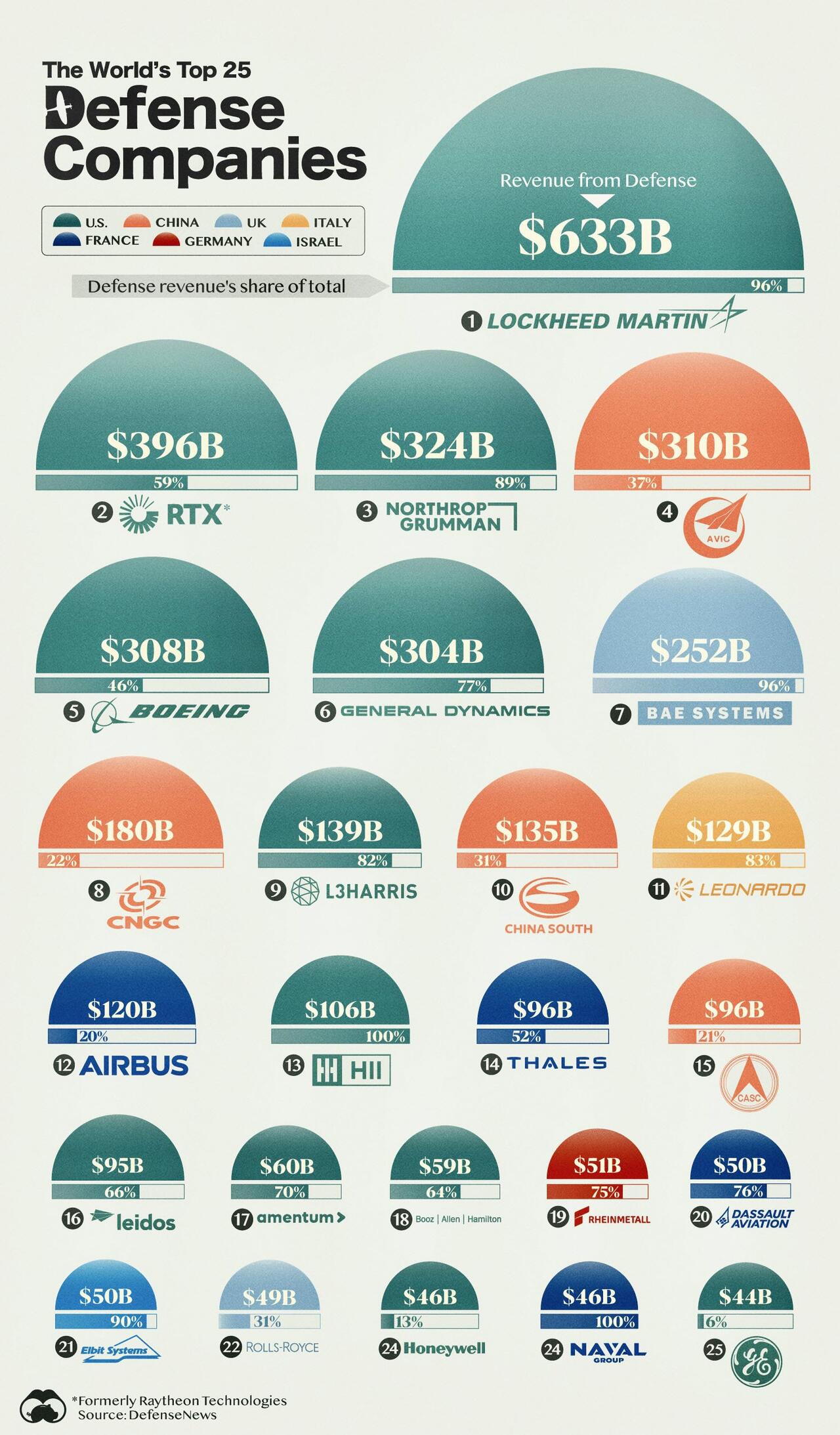 To gain insight, https://www.visualcapitalist.com/the-top-25-defense-companies-by-revenue/
